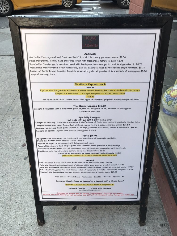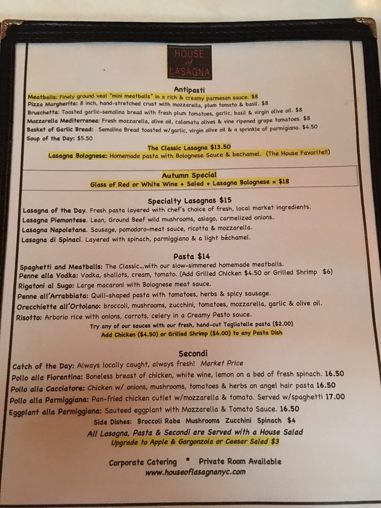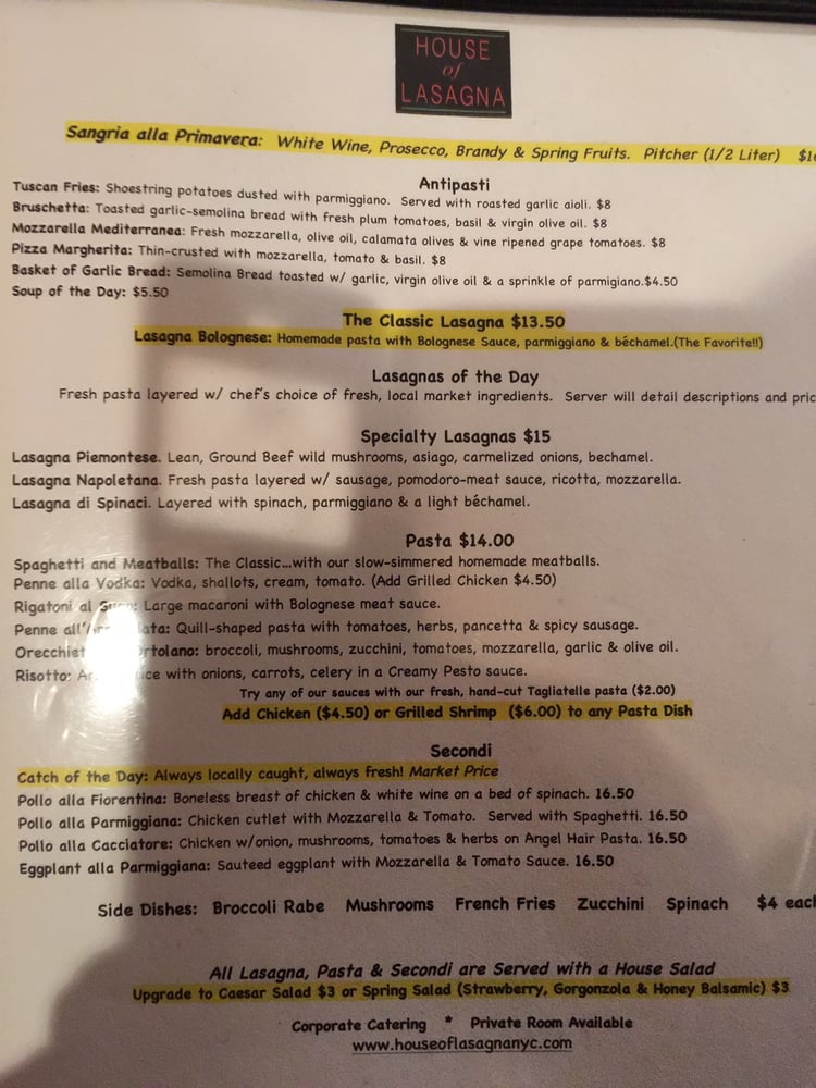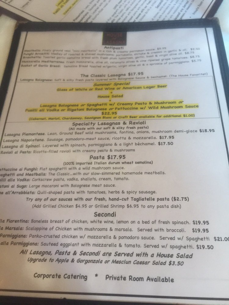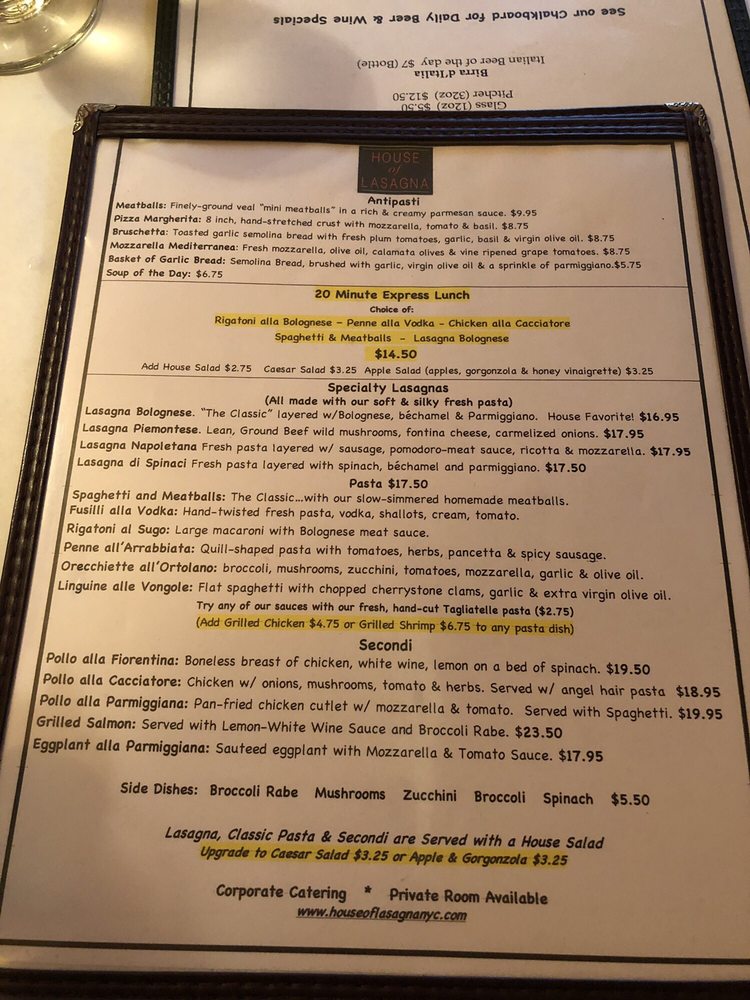 House of Lasagna Menu